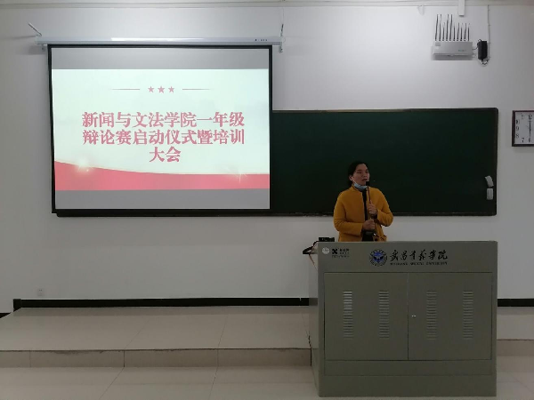 为丰富学生课余生活,培育学生的思辨能力和语言表达能力,融合各专业之间特征。新闻与文法学院于3月22日晚在嘉鱼校区教学楼A302教室举行了辩论赛的启动仪式暨培训大会。本次会议由辅导员王纯燕老师担任主持人,并邀请新闻与文法学院辩论队队长陈明泽,副队长袁智豪、唐仁歌等同学,为2020级新生举行培训讲座。