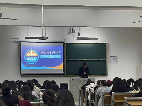 外国语学院2021级辅导员章顺超老师则进行了“反对邪教,崇尚科学”的反邪教主题教育,以“山东招远市麦当劳故意杀人案”引入,介绍了邪教的特征、邪教的危害,以及如何辨别和远离邪教等问题。结合我国的法律法规以及“平安中国建设”,帮助同学们树立正确的宗教观念以及深刻的理解我国的宗教政策和法律法规。