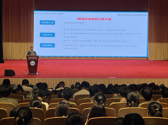 贺龙军首先结合实际案例,生动地为新生们讲解了常见的诈骗手段及防范方法。“犯罪分子的诈骗方式层出不穷,电话诈骗、网络诈骗、兼职诈骗等时常让同学们防不胜防。比如假冒公检法诈骗,犯罪分子会编造各种理由让你转账汇款,大家一定要保持警惕,不要轻易相信陌生人的话。”他以网络安全的重要性切入,向新生们介绍了网络安全的基本知识和防范措施。“在网络时代,我们的个人信息极易被泄露。同学们要保护好自己的账号密码,不随意点击不明链接,不下载来源不明的软件。同时,要正确看待网络信息,不盲目跟风,不传播未经证实的信息。”贺龙军的讲解让新生们对诈骗有了更清晰的认识。