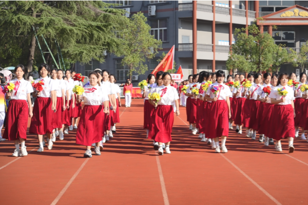 伴着激昂的旋律,国旗、校旗护卫队迈着铿锵的步伐入场。红旗方队、彩旗方队、鲜花方队、各运动员方队紧随其后。