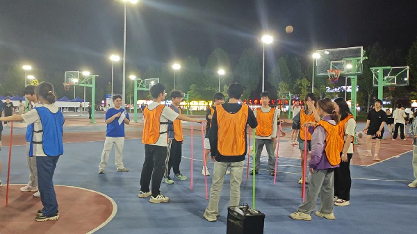 当晚,多个比赛项目轮番上演,选手们展开精彩的角逐。首轮“摸石过河”中,选手们手持泡沫砖,垫步,换脚,有条不紊,用扎实的步伐为队友奠定胜局的基调。随后的“拼音组词”环节,5秒限时考验着选手们的词汇量与反应能力“要快,也要对。”裁判简明地阐述了游戏规则,头脑风暴在每一次的传递中疯狂上演。“这个项目有点难”,来自广电2401班的张嘉怡说,“木杆的平衡很难把握,稍有不慎就会抓不稳。”“不倒森林”项目以高淘汰率掀起比赛的热潮,选手们紧盯木杆,在“换!”的指令声中迅速完成松手、跨步、握杆等一系列动作,尽管发令节奏不断变化,但众人仍然咬牙坚持,场下的加油声更是愈演愈烈。不放弃,不气馁的运动精神在这里得到了完美诠释。最后,充满趣味与欢笑的“蒙眼打人”环节,伴随着舒缓的音乐,为紧张的赛程画上了轻松的句号。随着夜色渐深,这场充满活力与温情的运动会也让选手们卸下了一天的疲惫。