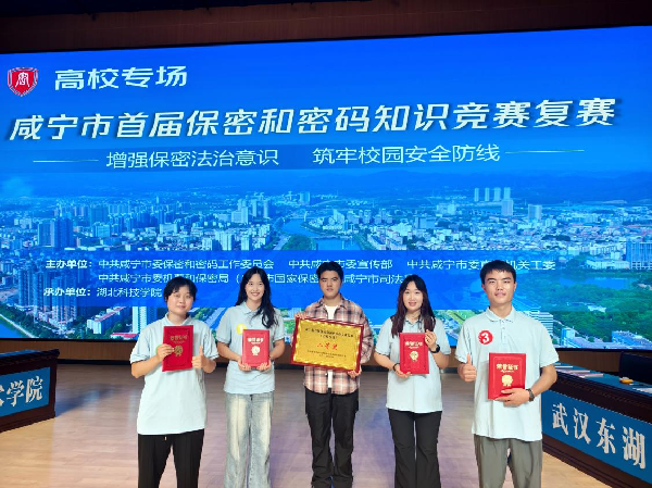 10月 10日,由咸宁市国家保密局主办、湖北科技学院承办的咸宁市首届保密和密码知识竞赛复赛(高校专场),在湖北科技学院揽胜楼学术报告厅落幕。我校威廉希尔WilliamHill官方网站组建的“争先队”,在带队老师吕奥迪指导下,由4名24级学子组成的团队奋勇拼搏,最终获二等奖,尽显首义学子的保密知识素养与协作能力。
