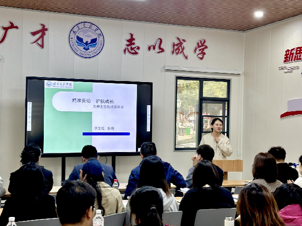 嘉鱼基地党总支副书记张晶以“精准资助、护航成长”为主题,深入讲解家庭经济困难学生认定工作的程序与要求,并对国家励志奖学金、助学金评审及学生评优工作进行了实务指导。她提出,辅导员应努力成为“政策执行的明白人、学生成长的引路人、困难学生的贴心人”,推动资助工作既规范落实,又贴近学生实际需求。