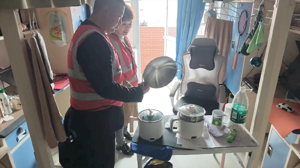 4月7日,专项检查组对8号学生公寓开展突击检查。工作人员严格按照“全覆盖、无遗漏、无死角”要求,逐寝室、逐床位开展拉网式排查,重点清查违规使用大功率电器、私拉乱接电线等行为,现场查获电煮锅、电热水壶等违规电器9台。检查人员依规对违规物品进行登记、暂扣,同步结合火灾典型案例,现场讲解违规用电的严重危害与相关管理规定,引导学生自觉遵守宿舍安全管理要求,树牢“安全第一、生命至上”理念。
